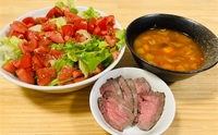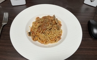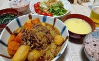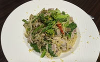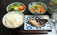 出来たおかずをお皿に移す時、ちょっとだけフライパンに残し、そこに水を350mlくらい入れて沸かしてパスタ100gを投入、適当に塩味をつけて水分が無くなるまで茹でる(だいたい規定時間+1分くらい)。良い感じに具の入ったパスタが完成。それを晩ごはんにする。美味しい…