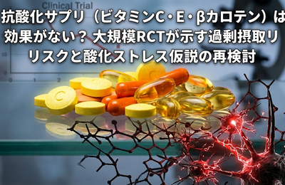 ビタミンC・E・βカロテン:抗酸化サプリの効果とリスクをRCTで検証 「抗酸化物質は健康に良い」「活性酸素は老化や病気の原因だから、抗酸化サプリメントで除去すべき」――このような主張を、健康情報番組や広告で目にしたことがあるだろう。実際、ビタミンC、ビタミンE、βカロテン、ポリフェノールなどの抗酸化物質を含むサプリメントは、世界中で数兆円規模の市場を形成している。 しかし、大規模な臨床研究の結果は…