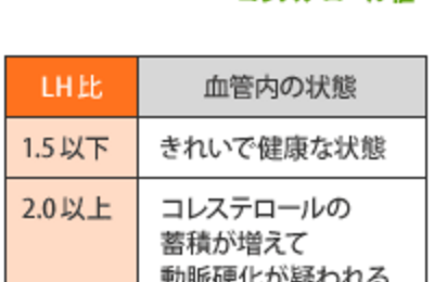 LH比 LH比(LDL/HDL比)は、血液中の悪玉コレステロール(LDL)と善玉コレステロール(HDL)のバランスを示す指標です。 計算方法 計算式: LDLコレステロール値 ÷ HDLコレステロール値 例:LDLが140、HDLが70の場合、LH比は 2.0 となります。 判定の目安数値が低いほど血管内が健康な状態、高いほど動脈硬化のリスクが高まります。リスクの状態1.5以下きれいで健康。理想的…