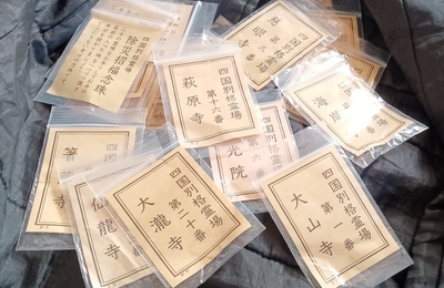 番外20霊場で集めた念珠珠を取り出して、どんなもんかととりあえずつないでみた。 珠の入った袋の寺院名を見るたびに、ここは妻と行った、ここは原付で行った、ここは知人と…特に妻がギリギリ一緒に行けた寺院に思わず眼がしらが熱くなる。 最初に一緒に行った仙龍寺、死を前にして苦労して参道を登った興隆寺、遺影に使った延命寺…88か所に比べれば、数こそ少ないものの、妻との思い出が詰まった旅でした。 さて、念珠を…