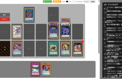 DDデッキ専用の一人回しツールを作成しました(スマホ非対応) カード個別の効果処理を設定しているのでスムーズに練習が可能です以下のリンクから使用できます https://ddd-sim-iqwc.vercel.app/ 機能 リプレイ再生 再生速度変更(5段階) 背景色・カードマス色変更 背景グラデーション切り替え 日本語・英語 デュエルログ表示 デュエルログ昇順降順変更 墓地・除外・EXデッキの…