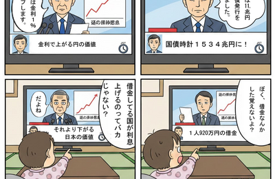 4コマ劇場「国の借金どこまでも」 当然です。子供でも分かります。 1,530兆円の借金を抱えてるのに、わざわざ利息を上げる必要がないのです。