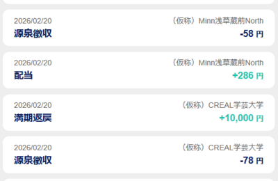 CREALの不動産クラファンを幾つか保有していますが、2月20日に(仮称)Minn浅草蔵前North と (仮称)CREAL学芸大学 が償還しました。 今回も J-REIT のインデックスETFを買おうかと思ったのですが、国内不動産より国内IP産業の方が好きなので J-REIT のインデックス等を買うのを止めて、代わりにバンダイナムコの単位未満株を4株購入しました。 今後、今年の8月から来年の初頭…