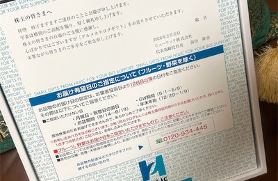 出社して15時間以上オフィスで過ごして帰宅したら、ヒューリックから株主優待のカタログが届いていました。 ようやく年数が経って、2品選べるようになったみたいです。 ざっとしか見ていないけれど、メロンがない!気がします。 何頼むか週末にでもゆっくり考えようと思います。