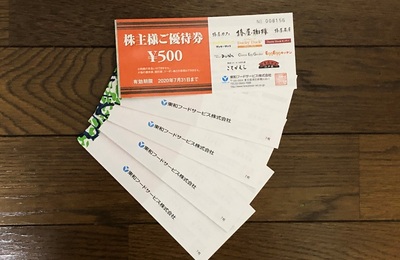 6月に、食事券が届きました。800株持っているので、500円×14枚=¥7000円分です。今までは、ダッキーダック(パスタ&ケーキ屋さん)で、ケーキを買っていました。が、コロナ禍で、テイクアウトを扱うお店が増えたので、最近は、ぱすたかん(お好み屋さん)の、テイクアウトお好み焼きを買っています。 コロナ禍の時代、経済的には大変助かります。(7月末期限の、食事券が残っています。早く使わないと……) 1…