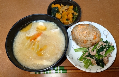 今日は平和な一日でした。 朝ごはん 7時に食べました 炊き込みご飯100g 小松菜とシーチキンの和え物 かぼちゃのそぼろ煮 豚汁 昼ごはん 野菜炒め定食 880円 前まであった冷しゃぶ定食の変わりかな。あっさりとした塩だれ味で美味しかったです。 夜ごはん 20時20分ごろに食べました。 トンテキニンニク醤油(下味冷凍) 小松菜とシーチキンの和え物 かぼちゃのそぼろ煮 炊き込みご飯 豚汁 かぼちゃの…
