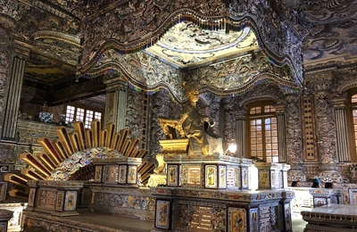 古都フエ行きツアー ツアーの詳細 お土産物店 カイディン帝廟 カイディン帝 カイディン帝廟 ランチ 古都フエ行きツアー ホテルのフロントでは、主要なツアーに申込むことができました。 古都フエには、自分で鉄道を手配していくことも可能ですが、割と遠い(ダナン〜フエ間は約100km)のと、現地での移動が大変そうだったのでツアーに参加することにしました。 ツアーの詳細 ・金額 75万ドン(3500円くらい…