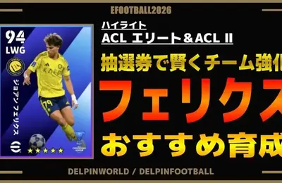 今回は「ハイライト:ACLエリート&ACLⅡ」で登場したアル・ナスル版、ポルトガル代表FW「ジョアン・フェリクス」のおすすめ育成をご紹介します。 イーフト2026|選択指名権「フェリクス」おすすめ育成【ハイライト:ACLエリート&ACLⅡ】 イーフト2026|選択指名権「フェリクス」おすすめ育成【ハイライト:ACLエリート&ACLⅡ】 1.選手情報・ポジション関連・おすすめ追加アイテム(ポジトレ・…