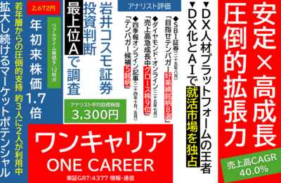こんばんわ、ポイ積 純一郎です🤗 ポイ積最強ポートフォリオにおいて、日本株の短期グロース株の唯一の銘柄、ワンキャリアの投資魅力についてまとめてみた。 ■会社概要 ■ 安定×高成長 ■ プラットフォームの圧倒的拡張力 ■ マージンを生むビジネスモデル ■ 拡大し続けるマーケットポテンシャル ■中吊り広告風まとめ資料 ■会社概要 “人の数だけ、キャリアをつくる。” が築くDX人材プラットフォームの王者…
