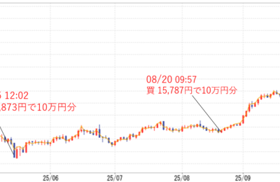 前回2025/10/15の投稿で、 【投資方法】 ●スポット購入。押し目買い。 【購入実績】 ●2023/12/08~12/18:10万円×5回スポット購入 ●2024/06/10~07/26:10万円×3回スポット購入 ●2024/11/07~12/03:10万円×17回スポット購入 ●2025/05/15~08/20:10万円×2回スポット購入 と書きました。このうち、2025年に実行した押し…