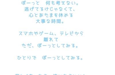 中・高生は心が不安定な時期。不安定な時期だから 物の見方を少し変えてみよう。考え方を少し変えてみよう! モヤモヤやイライラが減っていくはず! ぼーっとするときは、外の情報をシャットアウトするために、スマホやテレビ、ゲームから離れることがとっても大事。 ぼーっと空を眺めてもいいし、ぼーっと座ってもいい。「分からないけど、しんどい」は、心と頭が情報でいっぱいになって、疲れているサイン。 涙が出るのは、…