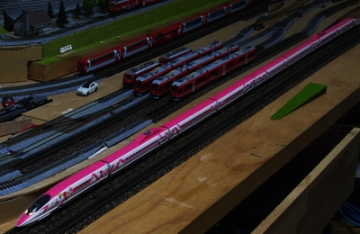 今日は、走行させます。 でも、我が家のレイアウトは、レーティッシュ鉄道を想定したものなので、 よく見える路線はR150なので新幹線は走れません。 しかし、わき役としてスイス国鉄の複線路線があります。 でも、ほとんどトンネルです。 ともかく、走らせます。 500系 キティ 初走行 1 1.4mほどの直線部分になんとか収まりました。 500系 キティ 初走行2 視点を下げると見覚えのある500系になっ…