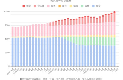 2025年(令和7年)10月末時点の総資産を集計しました。● 税引き前の総資産は、1億93万円でした。● 税引き後の総資産は、9,788万円でした。 尚、内訳は以下の通りでした。● 預金:3,791万円● 国債:1,500万円● Gold:451万円(手数料込み購入額114万円、含み益337万円)● 暗号資産:38万円(投資元本+預り金=10万円、含み益28万円)● 証券口座:4,313万円(投資…