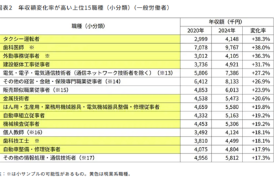 「賃金上昇率の上位はブルーカラー(現業系職種)が占めているぞ!」 という興味深いデータがありました。 2020年から2024年にかけて賃金上昇率の高い15職種は以下の通りとなっており、 黄色地がブルーカラーとなっています。 全体でも以下表の通りで、しっかり伸びているものの、上記職種群の伸びはとても大きいです。 近所に歯科医院がどんどん増えている状況であるのにも関わらず、歯科医師の収入が大きく伸びて…
