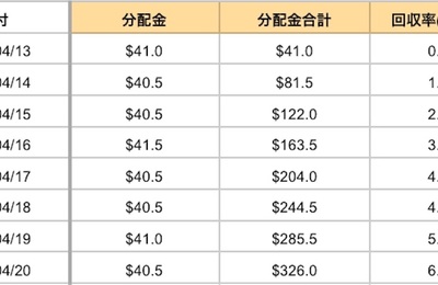 マイニング事業への投資に対する利益の分配が始まって1週間が経ちました。 今日はこれまでの分配状況について公開したいと思います。 以下が4/13から今日までの分配金です。 1日あたり40$強の分配が毎日行われています。 毎日4000円程度を受け取れていると思うとなかなか良い気分です! とはいえ、もともと出資金(5000$)に対する回収率はまだ10%にも満たない状況。。。 本当に喜べるのはまだまだ先に…