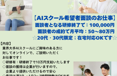 在宅ワークコミュニティT&Y 管理者:Takです! 新案件のご紹介! AIスクールに興味がある方への 説明・面談をしてくれるかたを大募集します! 【スタートまでの手順】 ①コミュニティ公式LINEを友達登録して 「メンバー登録」を行う 公式LINE:https://lin.ee/gBdbcBd ⇒ メンバー登録が完了したら メニューの「案件一覧」よりご興味ある案件を探す ②管理者LINEを友達登録…