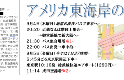 2008年9月4日 昼12時 旅行というのは計画している時が一番楽しい・・・。 そういう楽しい時間も終わり、とうとうやってきた・・・出発の日。 あんなに楽しみにしていたのに出発直前になると、 旅行に出発するのが嫌になってきた。 このまま出発せず、家にいるのもありだな。 そんな考えが頭をよぎりつつ、集合時間が近づいてくる。 難波で友達と集合して、まずは新大阪から深夜バスに乗って、東京へ向かう。 ※今…