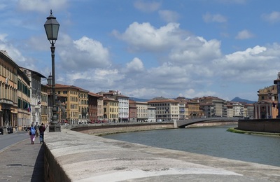 ピサ Pisa(2)街歩き 大聖堂からちょっと歩いて カヴァリエーリ広場 Piazza dei Cavalieri 騎士団の館・カヴァリエーリ宮 Palazzo dei Cavalieri と サント・ステファノ教会 Chiesa di Santo Stefano dei Cavalieri 騎士スタイルのメディチ家のコジモ1世像イルカが頭を踏まれているのだが… 広場のあちこちにある白地に赤い十字…