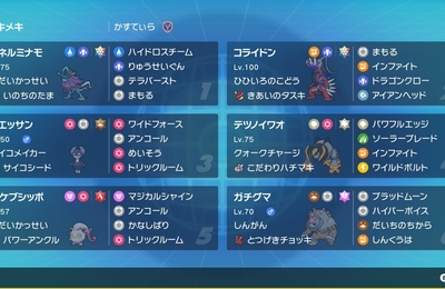 SV最後の公式大会、テラスタルクライマックスにエントリーしました。【ミライドンorコライドン】+【一般ポケモン1匹】の2匹のみで戦うダブルバトルです。 構築 素早さブーストや高火力範囲技で固めた強気な構築……という見た目です。しかし実際の対戦では、イエッサン♂とサケブシッポのトリックルームを軸としています。 対ミライドン選出:対コライドン選出:賑やかし: