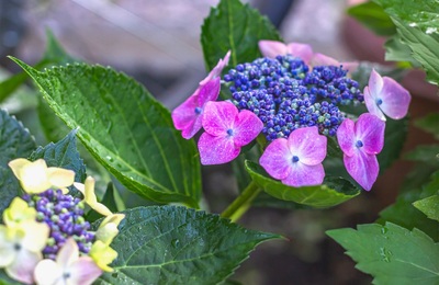 病気をして散歩が難しいので、 些細な自宅の庭に鉢植えして置いているガクアジサイが毎日色付いてくるのを見ている。 「ガク」と呼ばれる装飾花は、紅く色づくだけでなく、だんだん大きくなって中央の細かい青や薄紫色の花 (交配可能) を覆い尽くす様になり、アジサイという花がどういう進化 (?) を遂げたのかを窺わせる。写真の右端には菊のような葉が見えるが、隣ではミヤマヨメナも花をつけている。園芸のミヤコワス…