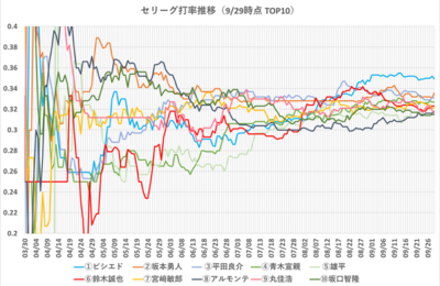 プロ野球 2018年打率推移(2018/9/29時点) プロ野球2018年シーズンのセリーグ・パリーグ打率上位者の打率推移です。 9/29時点での両リーグ上位10名の選手の日別の打率推移を紹介します。 2018セリーグ打率推移 2018パリーグ打率推移 プロ野球 2018年打率推移(2018/9/29時点) セリーグ 打率推移(2018) パリーグ 打率推移(2018) スポンサードリンク セリー…