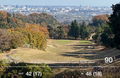 友人が会員になった相模野カントリー倶楽部を初訪問。別の友人のホームコース、東京ロイヤルゴルフ倶楽部(旧・大相模)のお隣の山にあるコースであり、雰囲気もよく似ている。 東京ロイヤルに比べると、フェアウェイは広く、両サイドが OB という厳しいホールはない(どちらかがワンペナ)。ただ傾斜で前方が見えない打ち上げ、ないし打ち下ろしのブラインドホールが多い。打ち下ろしでは、ドライバーショットが 250ヤー…