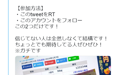 ツイッタープレゼント企画って夢ありますよね~。 例えばコレ! 7億当たった人がプレゼントしてくれるんですって! 応募しなくっちゃ!だって「※ガチです」って書いてるよ! みんなも応募してるし僕も(私も)応募しなくっちゃ! ーーーーーーーーーーーーーーーーーーーーーーーーーーーーーーーーーーー …………。。。。。。 危険だよおおおおおおおおおおおおおおおおおおおおお!!! 落ち着いて考えてみて下さい!…