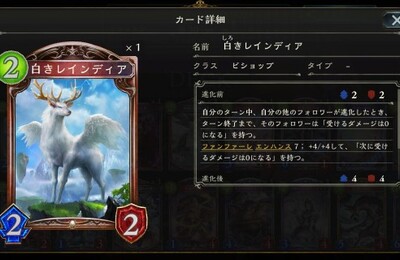 久しぶりのブログとなります! 今回は2Pickのビショップでオススメなブロンズカード2枚を紹介します! 白きレインディア このカードは進化させる他のフォローがいるときに場にいたら進化させたフォロワーの次のダメージを0にするカードです! 相打ちになる時や体力を高く残したい場合に有効です! 白きレインディアを進化しても自身に効果は発生しませんので注意が必要です!! また、エンハンス7で6/6のフォロワ…