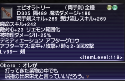 ようやくエルゴンウェポン「エピオラトリー」の餅鉄1万個の納品が終わった。途中、ワークスの発行チケット間隔緩和などがあり、エルゴンウェポン(魔剣のエピオラトリー、風水士のイドリス)を作る人が急増したためか餅鉄の競売価格が乱高下して結構大変だった。 エピオラトリー 次はOboroに黒の残魂を渡して強化するんだろうと思っていたのだが、先にやることがあるようだ。 Oboroと会話するとジョブポイントを10…