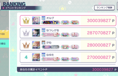 【ボク達の生存逃走】🎀 1位 300,039,827 P 目標としていた1位を獲得すると同時にチアフルにて初の3億ポイントを達成する事ができたイベントとなりました。 「GW・瑞希バナー・チアフル・対抗の人数・10日」と不安要素たっぷりだった為、実は前日まで吐き気がするほど緊張していました・・・😭 それでもこの景色を見る事ができたのはたくさんの支援・応援に駆けつけて下さった皆様のおかげです。 そして…