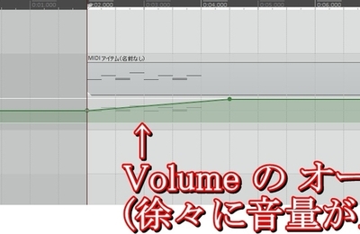 楽器の演奏音や、MIDIシーケンサーで打ち込んだ演奏情報による楽器音の音量や音の定位などに時間的な変化を加えたい場合には、オートメーションと言う機能を使いましょう。 オートメーションと言う機能では、音量を徐々に減衰させたり、音の左右の定位を、右から徐々に左へ移動させたりする事が出来ます。 オートメーション機能を使うには、トラックのオートメーションボタンをクリックして、トラックのVolumeやPAN…