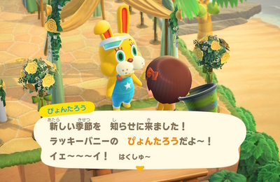 皆さま、お久しぶりです。 めっさ前回更新より、 時間がたちました、、、、。 はやいもんじゃのう。 クスクス(๑>◡<๑) カブ価💹で、損失をだし続け、 更新途絶えてました。(T-T) (もちろんカブリバのカブよん) 久しぶりに大大黒字になったので、 本日は余裕で村のチェックです。 すると、、 ぴょん吉野郎が! 間違えた!ぴょんたろうじゃん‼️ 名前間違えてたわ。わりぃ💦 このうさぎ、近くによると、…