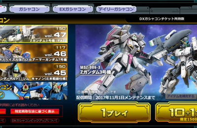 DXガシャvol.47来ましたね。 中身はFAZZとZガンダム3号機です。 Zガンダム3号機はZガンダムのコスト380よりも20低いコスト360です。 そして武装はZガンダムよりも魅力があります。 まずこの斉射式頭部バルカンです。 弾が少ないだけの劣化バルカンだと思われるかもしれませんが、これは弾が2発同時に出るタイプのバルカンです。 要するに弾は倍、連射速度も倍として考えればいい武器です。 そし…