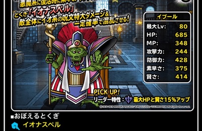 イブールが新レジェンドモンスターとして追加されましたね。 悪魔族!特性ぶっこわれ!!攻撃とくぎもめちゃ強そう!!!な感じです。 なんとか1体ほしいのですが、今ガチャを回すと交換券来た時に泣きを見そうなので、まだ我慢します… いやでも欲しいなぁ… イブール自身の素早さはかなり遅い方だと思うのですが、特性がめちゃめちゃ強く、悪魔全員に開幕リザオラル+復活時素早さ50%アップ+真いてはじゃないと剥がせな…