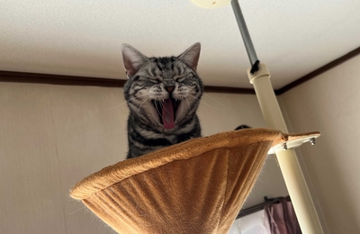 昨日の朝、目が覚めて外を見るとほんの少しですが雪が積もっていました。 カノンはハンモックの中で大きなあくびをしています。 部屋を暖房すると暖かい空気が上に上がって行くので、暑がりのカノンはハンモックから降りてソファーの上で寝ています。 そんなカノンの姿を見ていると、大人になったなと感じます。 顔も子猫だった頃の面影が無くなりました。