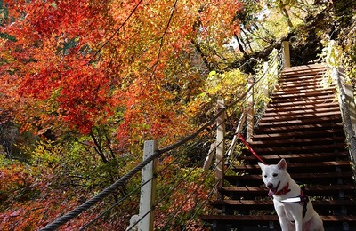 昨日の紅葉はイマイチだったので、今日は山梨の大柳川渓谷へ。 前回にチャココと行ったのが12年前でした。 新しく開通した中部温暖自動車道でかなり近くなりました。 渓谷の紅葉と、九つの吊り橋を楽しめるかな? たべつく館から遊歩道を下って渓谷へ。 最初の吊り橋(竜神橋) 紅葉がキレイです。 この吊り橋は、珍しい階段状の吊り橋で、途中に踊り場まであります。 急な階段吊り橋で、しらたまもちょっとビビってる?…