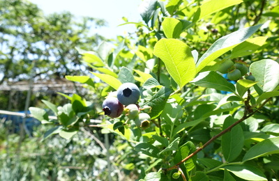 ブルーベリーが4粒口に入りました スイカは4本植えました 種を書いたマクワウリも本葉が出ました トマトは一段目には実が付きました キューリ 夏野菜も植えつけて2週間が経ちました。