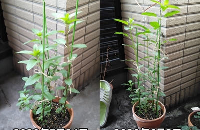 5月24日と6月3日の比較 支柱よりも長くなりました 匍匐茎も鉢からはみ出ている 5月24日と6月3日の比較(高さ) 一番高いところで約60cm 前回が約40cmと書いてあるので、伸びる速度も速くなっている?