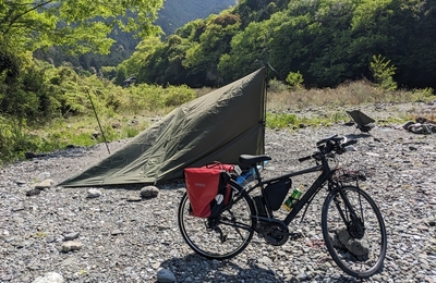 ゴールデンウィークに奥多摩の川井キャンプ場にTB1eで行ってきました。自宅から約50km 、3時間半のツーリングです。前カゴに焚き火道具とDDタープ、リアキャリアにその他のキャンプ道具と食材一式を積んで出発です。 途中で休憩した南公園で撮影 多摩川沿いを上流に向かって進み羽村から奥多摩街道→青梅街道を通るルートで川井キャンプ場を目指します。 青梅あたりから微妙な登り坂が続き、3段階あるアシストを2…