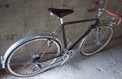 昨年入手したアルプスのヘッドバッヂが付いたフロントフォーク無しで廉価な650A対応ランドナーフレーム。 使用されてるパイプがハイテンかクロモリか判然としなかつたので、クロモリだつたら儲けもの位の軽い気持ちで購入。 大雑把にいふとシートポスト径からクロモリなら26.8でハイテンなら26.2か26.0と判別できるのだが、手元に来て調べてみるとこのフレームは26.0径。つまりハイテンだつたのでハイテンシ…