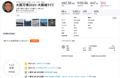 サイクリング日記:10/10(金)は大阪万博2025会場の東ゲート入り口、10/12(日土)はビワイチ長命寺から荒神山ヒルクライムに行きました。 ロードバイク:距離182.38km、時間9:55、獲得標高647m 2025年のビックイベントが大阪の夢洲で開催されていた大阪・関西万博サイクリングで、滋賀県から京都を経由し大阪港まで「山科川→宇治川→木津川→淀川」のリバーサイド・サイクリングコースで行…