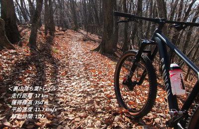 裏山落ち葉トレイル(→17km、750m、1h35m) 朝は氷点下近くまで冷えたようだけど、今日も良い天気になった。MTBで裏山下りに出かけた。 10時過ぎにCANYON号で出発して小田切側から裏山へ向かう。 北アルプスが良く見えていた。 分水嶺まで登り、少し下ってから再び山頂目指して登る。 山頂に着いて景色を眺めてから落ち葉トレルを下りた。 先週、先々週は落ち葉にハリとコシ?があって、ふかふか感…