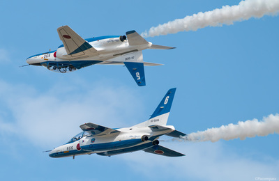 会場正面でソロ2機が高速交差する場面。 ブルーインパルス撮影に慣れてくると撮りたくなるシーンのひとつ。 今回も運まかせでしっかり失敗したので記録しておく。 バックトゥバック。これは両機一緒に追うので難易度低め。 さて、オポジットコンティニュアスロールですが、 それぞれ時速700kmで交差するとか。それなりの望遠でフレームインさせるには秒10コマじゃマグレに奇跡を重ねんとダメじゃないか? 秒20コマ…