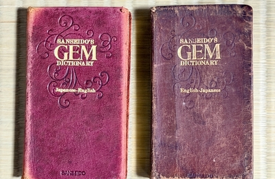 写真の二冊は、三省堂の小型辞典で全く同じものである。しかし、良く観ると左には「Japanese-English」とあり、右には「English-Japanese」の金文字が箔押しされているのが判る。実は一冊の表と裏に英和と和英の辞書が同居しているのである。左が愚妻のもので、ほぼ未使用で透明なビニールケースにはいったまま本棚にあった。そして、擦り切れてヨレヨレになっている右側が私が使っていたものであ…