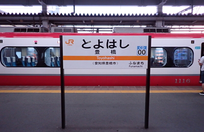 「パノラマスーパー」で名鉄名古屋駅から豊橋駅まで移動しました。前面展望なので約50分間全く退屈しません。 (豊橋駅の駅名標はJR東海仕様)