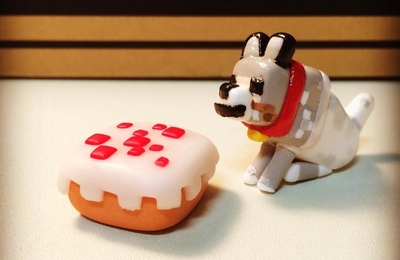 おはこんばんちは、フェイクフード大好きはちまるです。 みなさん、minecraftやってますか?ε=ε=(ノ・∀・)ノ minecraftは、ブロックでできた世界を冒険したり、いろいろ創ったりするゲームです。パソコン、携帯、xbox?と今はいろんな機械で遊べるようになりましたね♪私も、一時期めちゃめちゃはまってました。 今日はそんなマイクラから、わんちゃんとケーキです! 野生の狼に骨をあげると一緒…
