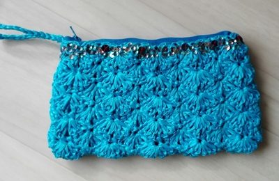 大好きな夏の色、エコアンダリヤです。今回はとっても夏っぽくビビッドなブルー。 キラキラした水面をイメージしてスパンコールで飾りつけ。糸は艶やかな赤色でセンスアップです。 使いやすさも考えて、苦手な内袋も取り付けました!