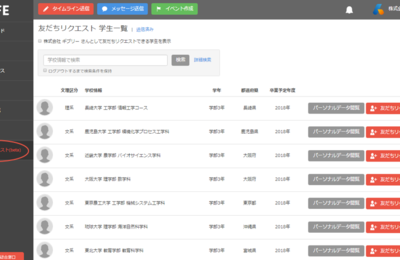 いつもLIFEをご利用いただきありがとうございます。 今回のアップデートに伴い追加・改善された機能を以下にご紹介いたします。 友だちリクエスト機能を追加 従来は、合同説明会やイベントでの友だち追加依頼また学生がアプリ内で企業様を見つけ、友だち追加がメインとなっておりました。 今回のアップデートでは、まだ友だちになっていない登録学生を各項目の条件を指定のうえ検索し、企業様側から学生に対して友だちリク…