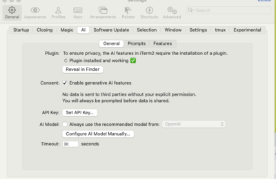 いつの間にかiTerm2にAIプラグインなるものが搭載されてたので、せっかくなのでローカルLLMで試してみた。 blue1st.hateblo.jp 前提情報 うちの場合、ローカルネットワーク内のマシン(EVO-X2)で動かしていて IPアドレスは192.168.1.33 ポートは10000 モデル名はgpt-oss:120b となっている。ここは自身の環境で読み替えて欲しい。 設定 Settin…
