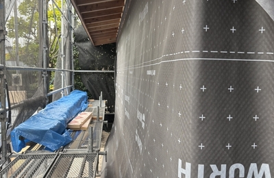 今回は着工から11週目から13週目をまとめました。 ドアとサッシがついて、ブルーシートもようやく取れました! 着工75日目 外部の石膏ボード上に透湿防水シートが張られ始めました。 ドイツのウルトの製品ですね。高耐久ということで名前は聞いたことがあります。 そして、ついに玄関ドアがつきました! ユダ木工の超断熱タイプの引き戸です。二世帯住宅なので車椅子やロードバイクの出し入れを考えると引き戸のほうが…